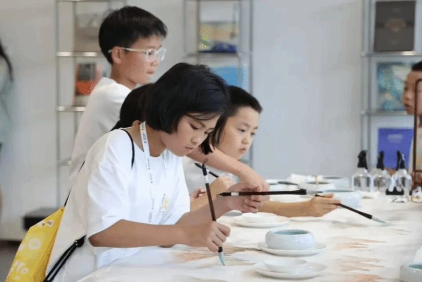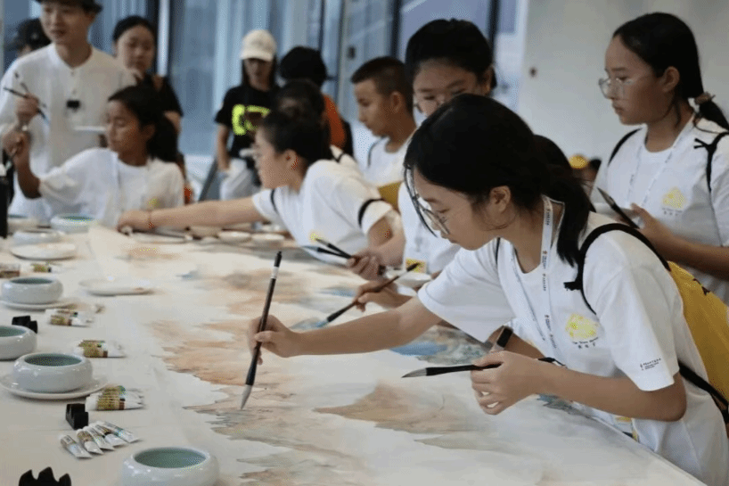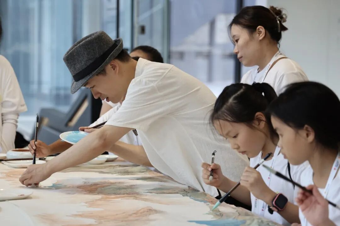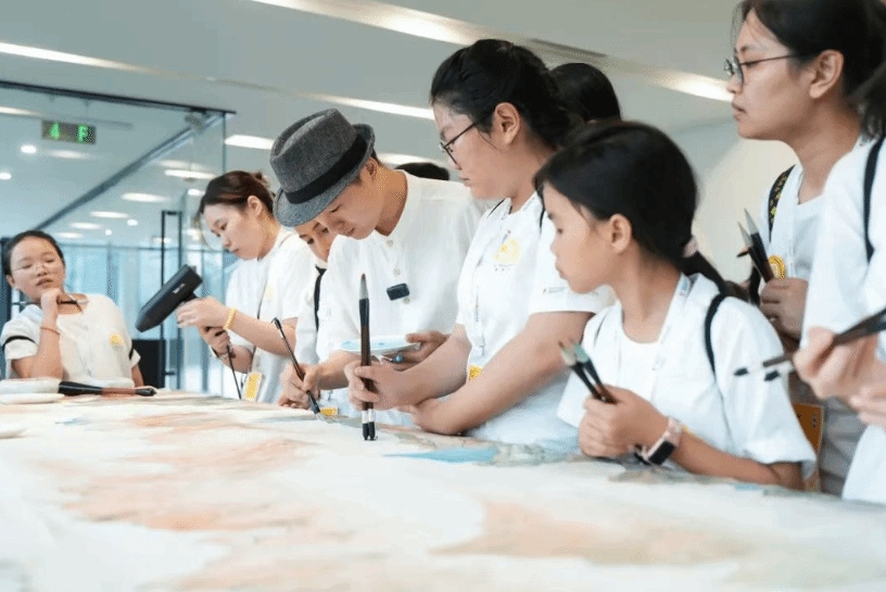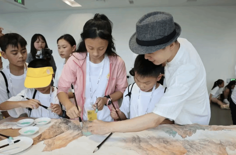 夏令营学员来到绘画天地,体验了为画纸上的山峰涂抹上青绿色彩的过程。中国画学院博士李沅骏一边做示范一边讲解绘画要点,帮助孩子们理解国画技法,感受绘画的乐趣。