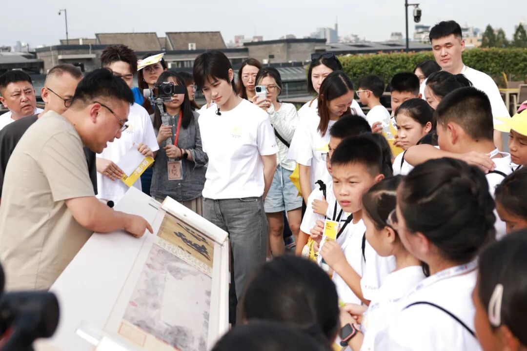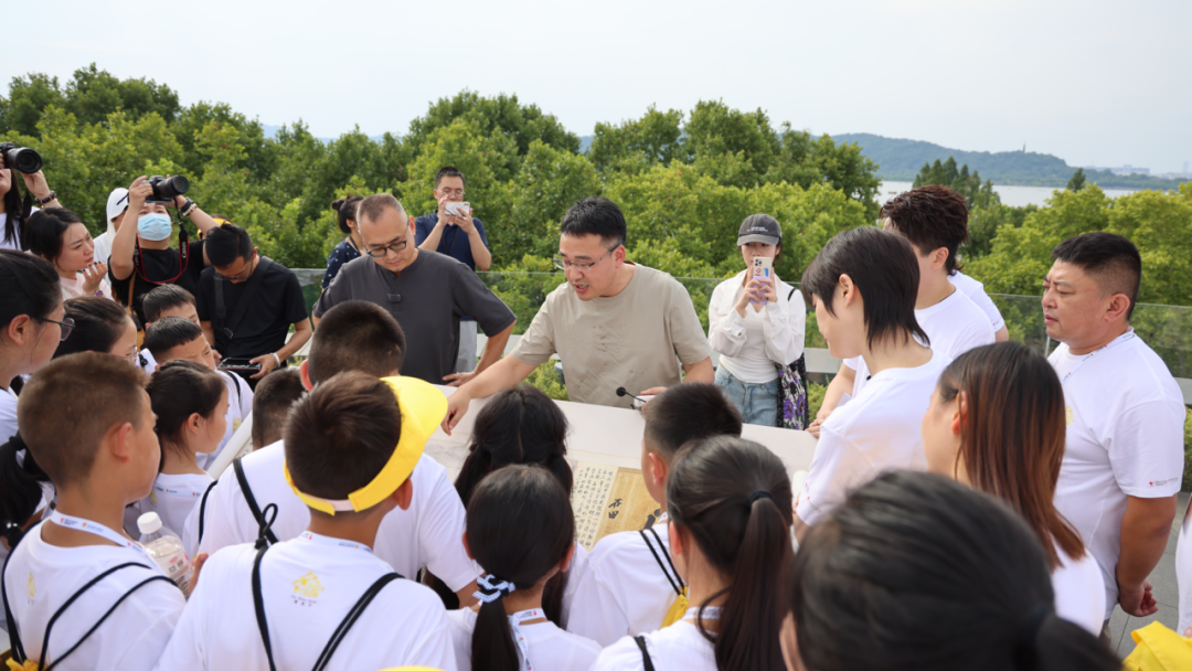 参加夏令营的师生共聚天台,在中国美术学院美术馆副馆长夏商周和跨媒体艺术学院副院长高世强的导读下,欣赏古画李嵩的《西湖图》(复制本)。隔着时空,大家与古人望着同一片湖水,品读着同一份画卷,画中山水与远眺可见的西湖景致形成了古今对话的独特意境。