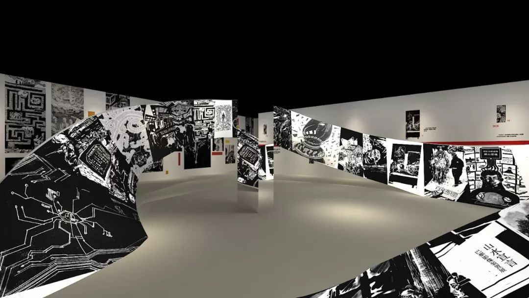 木铃木刻社结合科幻小说文本「寄言2028」,以强烈突出的黑白木刻语言画面来讲述学院1928年与2028 年的20个场景,木刻语言中隐伏着众多新颖的概念和奇绝的思路。巨大的莫比乌斯环装置呈现出无穷的生成力,1928与2028的图像路径不断分岔与重合,最后汇聚成融构了现实和想象的差异空间。真正的前行,需要一次又一次探寻与开拓每一个学院的历史航标。黑白木刻手法结合灵活的空间策略成为了用行动解释路径或记忆的最好方式。