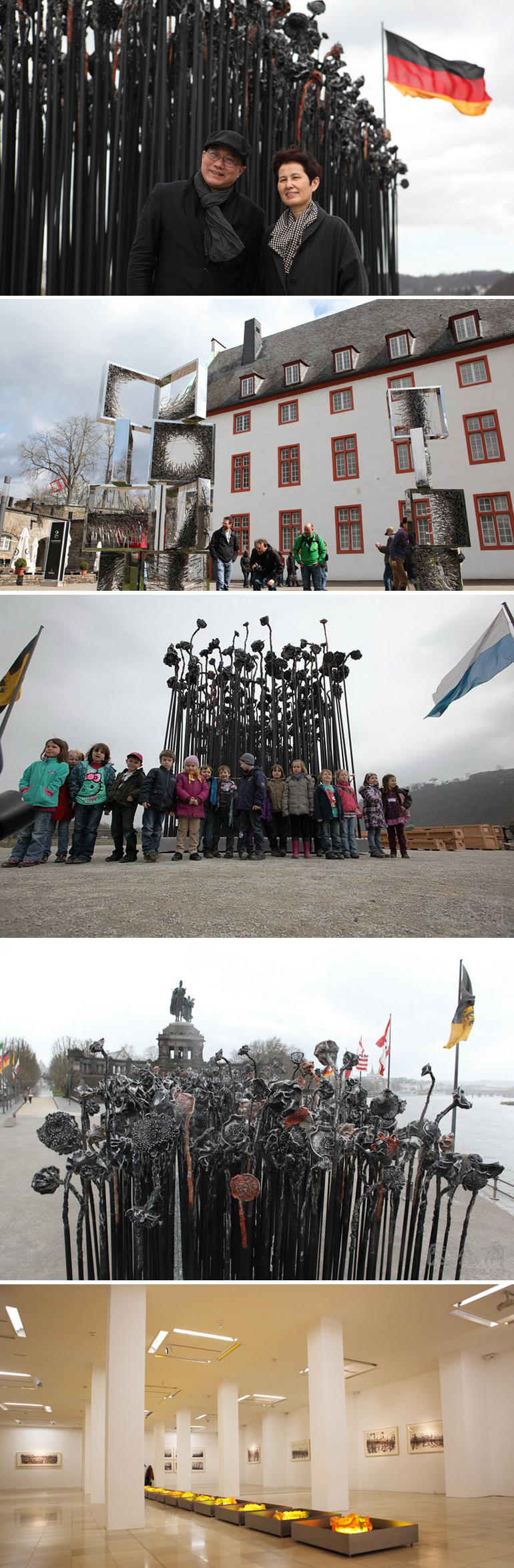 路德维希博物馆坐落在莱茵河畔的德意志角。德意志角是德国统一的纪念地,德意志精神的历史地标,德意志民族精神的记忆之场。这是迄今为止首位艺术家在此展示作品。这次展出的主打作品是许江的一件名为《共生》的大型雕塑。这个由800株6米高的向日葵雕塑组成的钢铁阵列,与德国首任皇帝威廉大帝的雕像遥遥相对,被《莱茵与摩泽尔报》评论为“德意志与中国两个文明之间的一次意志与精神的对话”。《波恩时报》的评论文章则诙谐地把这片向日葵称为“国王的新邻居”。在今后的两个月中,往来于莱茵河上的游客们将通过这片来自中国的钢铁葵园,真切地感受到一种抚今追远的历史情怀,一种中欧之间文化共生的美好展望。