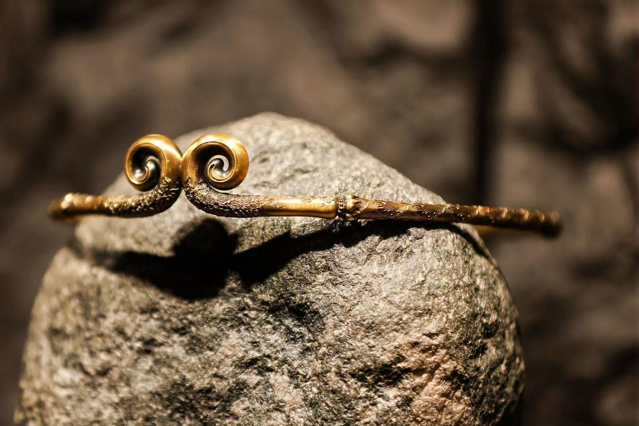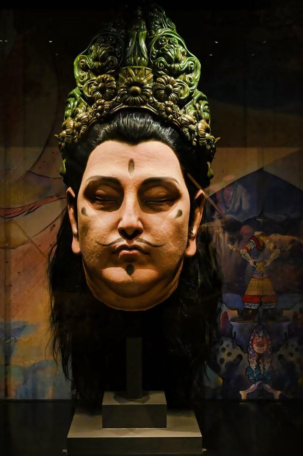 一块人头形的石头上戴着一个金箍,纯金打造,为此次展览专门定做;