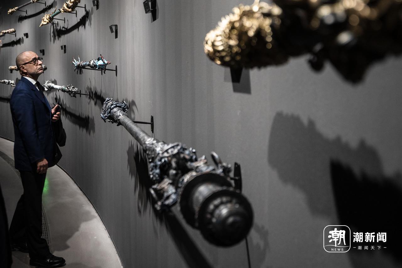满墙的武器和药葫芦,各种造型和名字,其中也有金箍棒,都是为展览赶制出来的,可以真切感受到这些武器在现实物理空间里是什么样的质感;