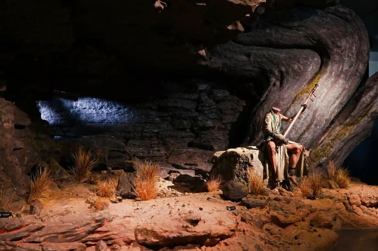 20多米高的崖壁(馆内实景5.5米高)下,无头身半披粗布破衫,手弹弦琴,在隐隐回荡的说书乐中,等候着每一个瞪大了眼睛向他靠近的人。