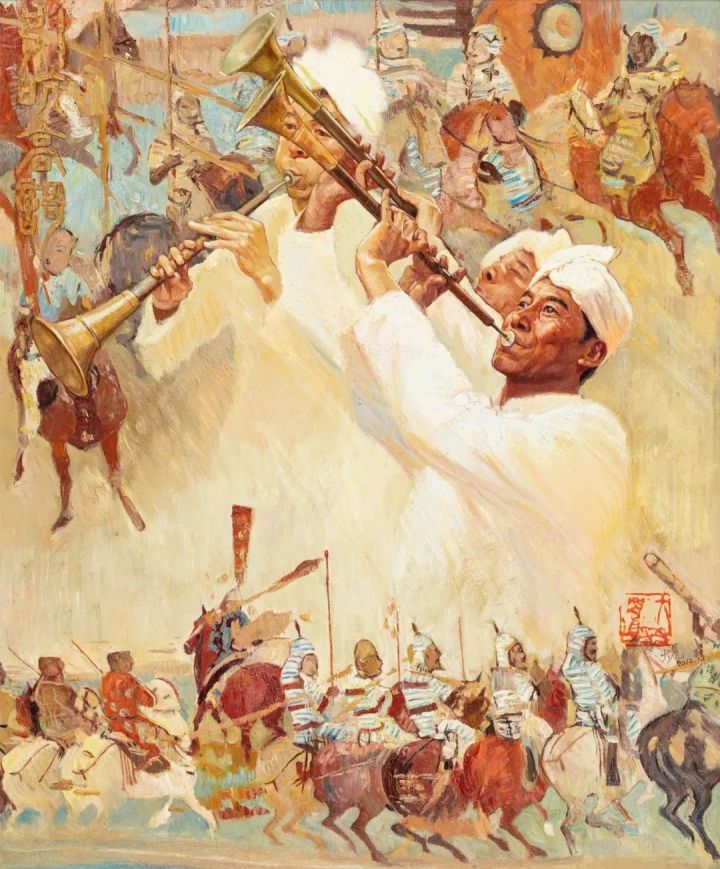 从20世纪60年代初出校门创作的《青春年代》《在战斗中成长》到《上前线》《老将》,再到《淮海一日》《路条》,秦大虎作为20世纪中国军旅题材代表画家,在新中国美术史上具有重要的地位。作为战争年代的亲历者,他咀嚼革命战争的残酷和艰辛,化育出胜战凯旋的场面和激情。这种历史性的瞬间回望,由于洋溢其中的真情,令我们难忘。同时,也成为迥异于西方战争题材的作品,凸显中国人传统的生命乐观的态度。