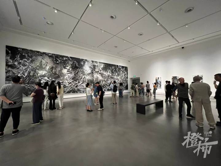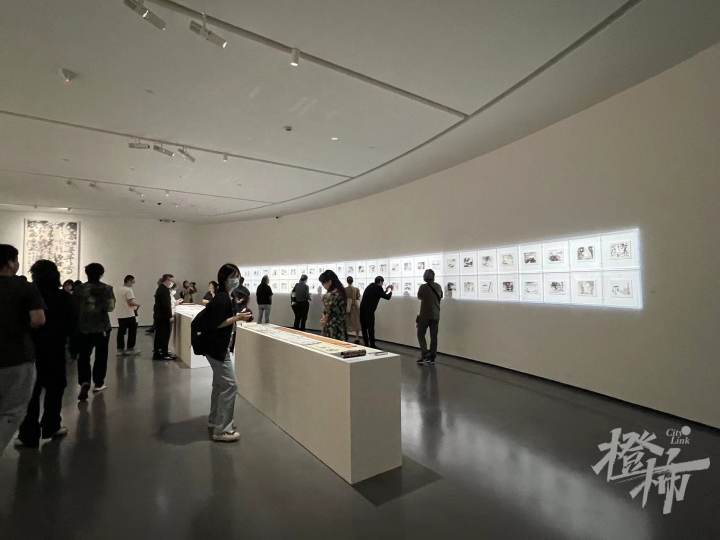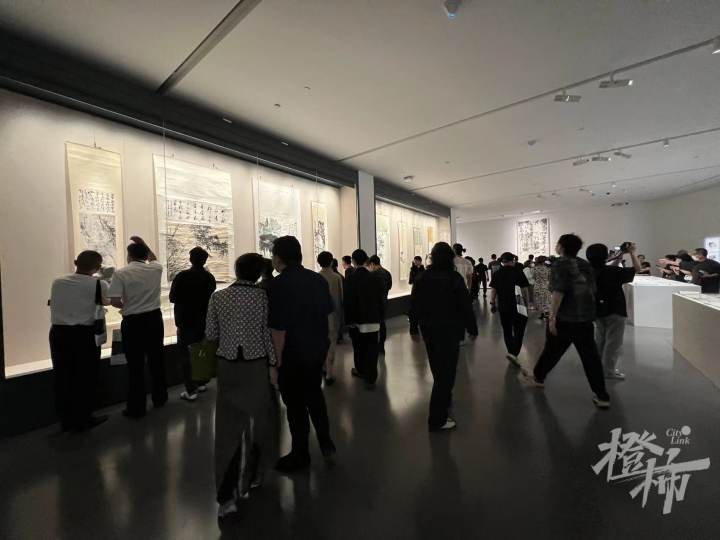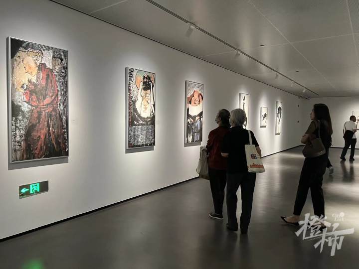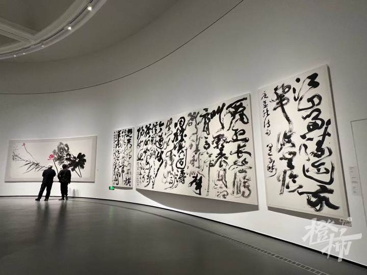 美术馆一楼圆厅“裳裳者华”板块以闵学林花鸟作品与描绘湖山的“西湖掠影”构成,回溯数十余年创作风貌的同时,一表艺术家对湖山的画心情志;“超以象外”板块则以闵学林巨幅书法为主,呈现奔浪惊雷、鸾舞蛇走的狂草之姿,展示闵学林七十余年的书法探索之路的最新面向。