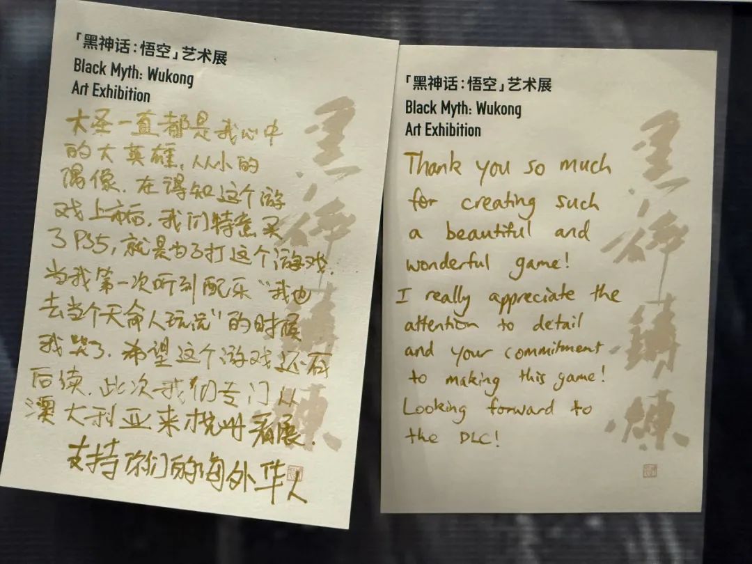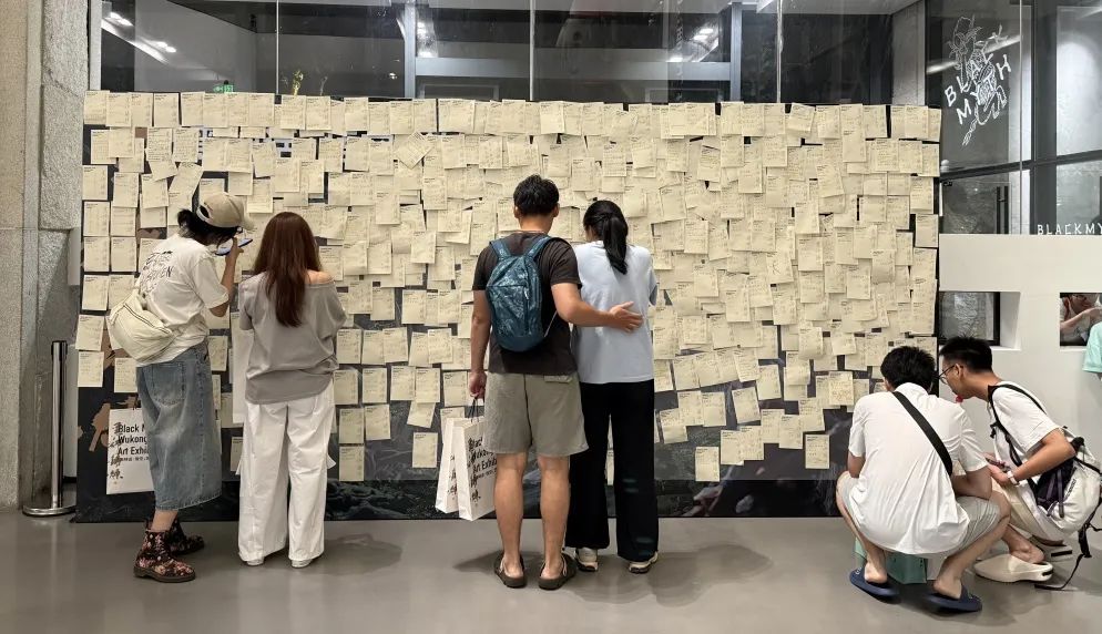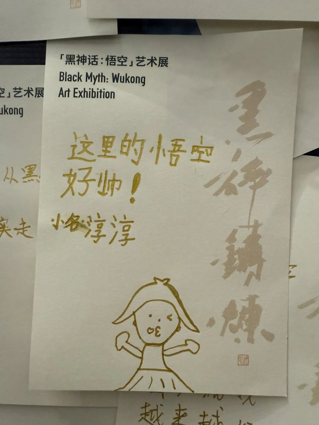 当日下午,一楼大厅以《黑神话:悟空》艺术展主视觉为背景的留言板成为焦点。定制留言卡分发至亲临现场的观众手中,他们执笔写下关于这部史诗级游戏的震撼体验,表达着对本次艺术展的所思所想,有感于个人与游戏的连接,现场留下天命人的心声,时空听见天命人的箴言。