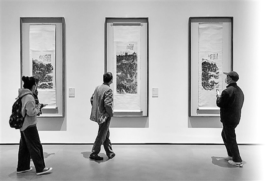 前几天,浙江省美术协会副秘书长李云雷带朋友在马远的《松寿图》前观看时,建议大家往后退两米,“遂见骨骼清朗,愈远境愈深”。“同样看宾翁老人画,近看一片混沌,远观丘壑万千。”这是黄宾虹对宋画的一种回应。