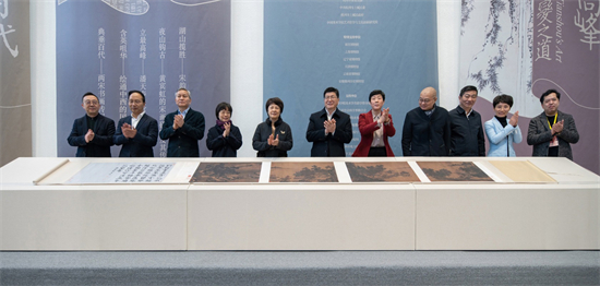 嘉宾共同展开《四景山水图》(复制件)画卷为展览启幕;受访者供图