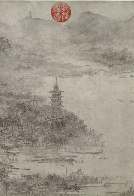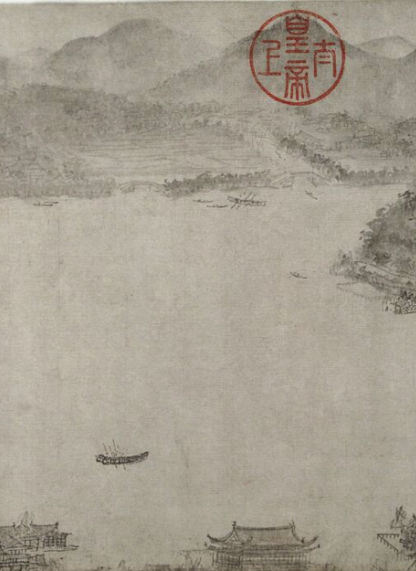 很可惜北高峰塔在画面上几乎会被观众忽略——五百年后,乾隆爷的一方大钤印“太上皇帝”,把原来在古画纸上就有所消褪的北高峰塔,完全给镇住了。