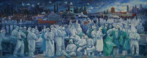 《浙江援鄂医疗队》 梁怡、苗玲、初千卉、单飞达、柯榕程 100×250cm 布面丙烯