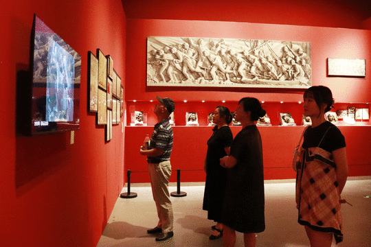 ▲ 序厅两侧,矗立着浙江文艺人历史群像和浙江百年创造文化集锦两块“丰碑”,中央陈列着《攻坚》雕塑小稿。