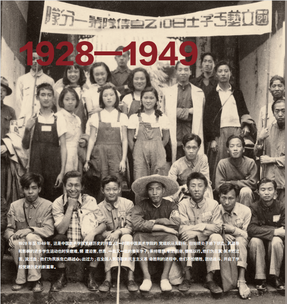 1928年至1949年,这是中国美术学院党建历史的开篇。这一时期中国美术学院的党组织从无到有,但始终处于地下状态,其领导和影响的进步学生运动也时受磨难,频遭迫害。然而,一批又一批的青年学子,秉持理想,前赴后继,慷慨以行。他们为左翼美术吃过苦,流过血;他们为民族危亡尽过心、出过力;在全国人民夺取新民主主义革命胜利的进程中,不怕牺牲,团结战斗,开启了学校党建历史的新篇章。