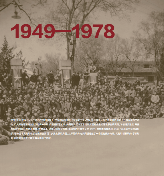 1949年至1978年,在中国共产党的领导下,学校的历史翻开了全新的一页。学校在社会主义艺术教育思想指导下开展各项教学活动,广大师生逐渐树立起与时代一致的价值观和艺术观,共同肩负起以艺术讴歌我国社会主义建设事业的责任。学校逐步建立并完善各级党组织,在思想教育、教学改革、创作研究各个方面,都以党的社会主义文艺方针为根本指导思想,形成了在现实主义的旗帜下,各种艺术风格和教学方法兼容并蓄、多元发展的局面,从不同的方向共同塑造起了一个既能保持传统,又能引领新风的学校形象,为我国社会主义建设事业作出了贡献。