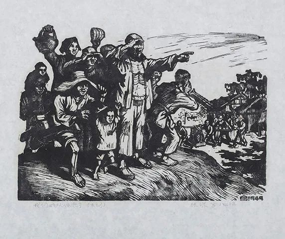 3.《我们的队伍来了》,1949年,黑白木刻。此作是张漾兮平时无数次生活观察得来的,场面虽为虚构,但这样的场景在生活中却是必然的。作品表现了劳动人民对解放军的期待心情。此作于1949年完成于香港,中国正处于民主革命到社会主义革命的转折点,也是张漾兮个人艺术道路的转折点,标志着歌颂新社会、迎接光明的开始。