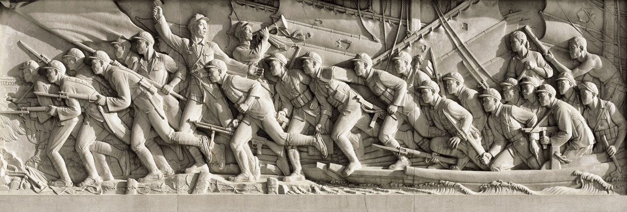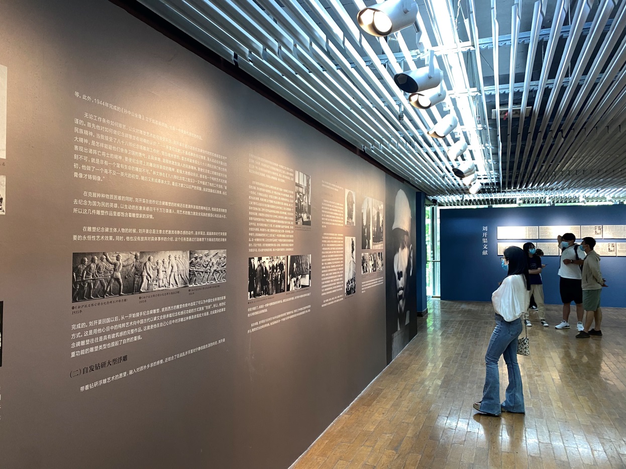 “立民族之碑——共和国开篇之作人民英雄纪念碑”(1949-1958)是新中国首个国家重大公共艺术工程,也是最重要的美术工程项目,整个纪念碑的碑额花纹浮雕、台座正面的三块主题浮雕《胜利渡长江 解放全中国》、《欢迎解放军》、《支援前线》和碑身毛泽东主席题写的“人民英雄永垂不朽”、周恩来总理撰写的碑文放大、设计制作等都出自刘开渠之手,三块浮雕是他最有影响力的代表作品。