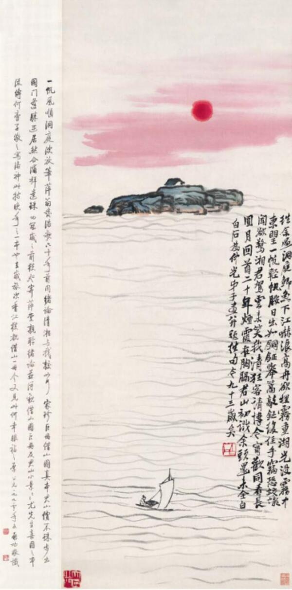 启功题跋齐白石《一帆风顺图》 设色纸本 立轴 102cm×39.5cm 1953 私人藏