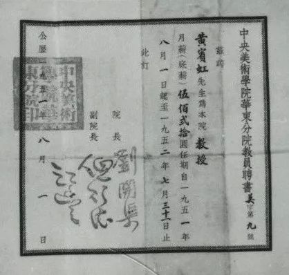 1951年8月中央美术学院华东分院聘请黄宾虹为教授的聘书