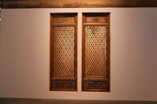 穿过休息厅就是展示生活用品的“日用即道”区域,这里摆放的都是以前使用的老式生活用品,包括化妆盒、食盒以及十里红妆用具等。沿着楼梯下去则是最后一个“格物之知”展示区,里面收藏的100件窗阁,每一件窗阁的纹样都是不同的。为了让光影达到最佳效果,策展团队还在窗阁里打上竹叶、花朵的光影。