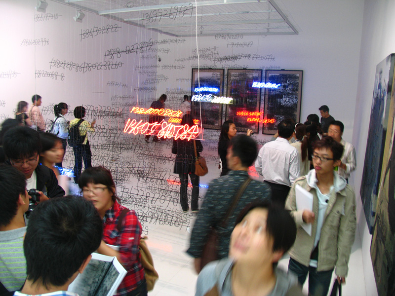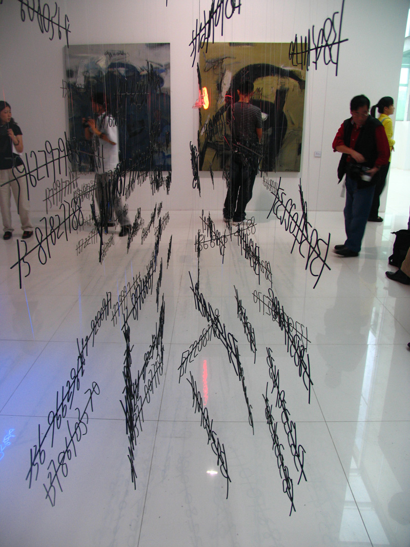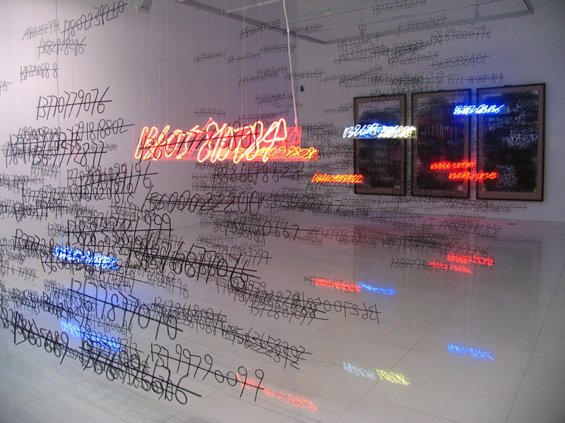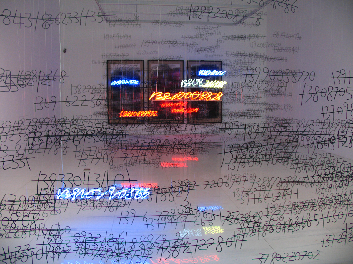 我的绘画装置作品《蜃市》,是以我手机内存的朋友电话号码为元素的创作。表达了生活于数字化时代的每个人,正被数字所表征,并成为一组数据,进而被编码的困境。我们正生活在被数字化的现实里。尤其当每个人的数据被呈现在文化的现实社会里,活生生的人本身已被虚化,而无数个具体人的数据则成了眼前“海市蜃楼”版的虚妄景观…因此,在哪里重建人的肉身情境,在哪里获得本真的实在,“景观再造”正是我作品想要呈现出的悲喜交集。